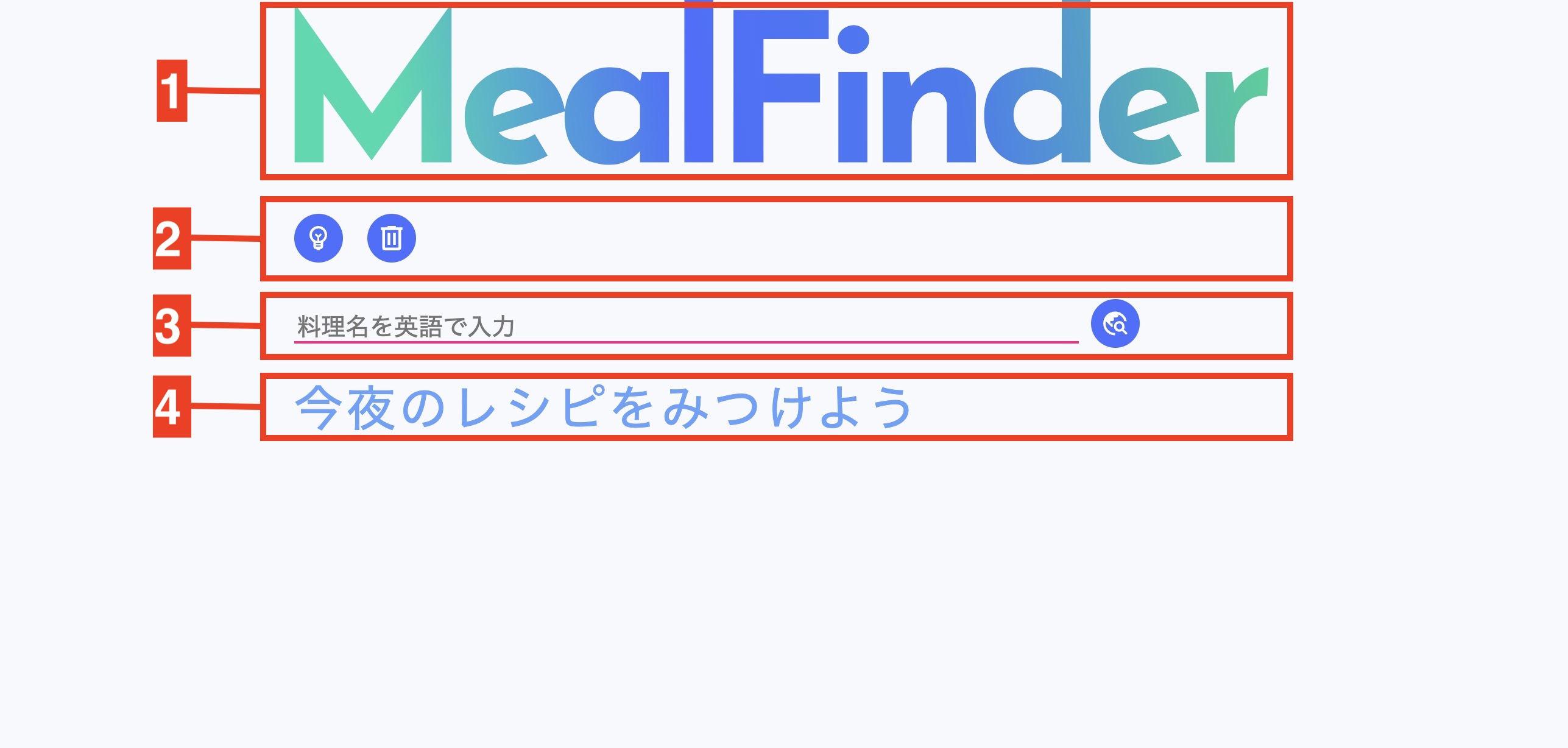 ぱっと見ただけだとわかりませんが、次のように線で区切ると、この画面は「1:ヘッダー」、「2:ボタン欄」、「3:入力フォームとボタン」、「4:テキスト欄」の4つの部品、つまり4つのコンポーネントから構成されているのがわかります。