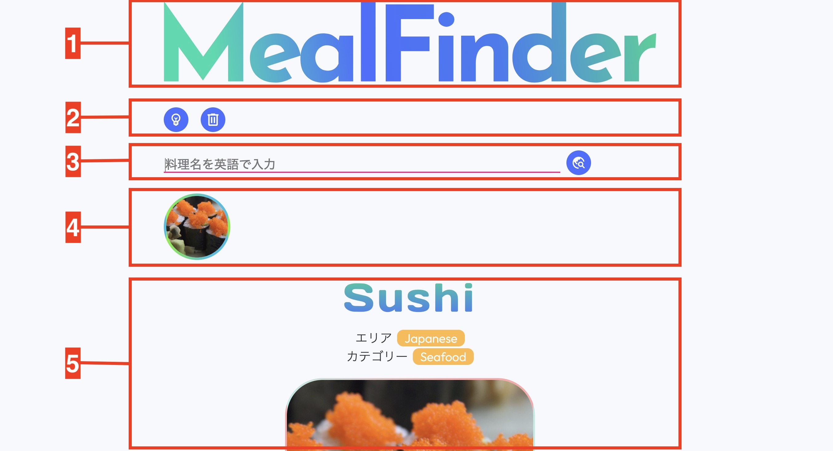 次は、入力フォームに「sushi」と入力して検索してみましょう。寿司のレシピが表示されます。この画面では、先ほどの「4:テキスト欄」の代わりに、「4:検索履歴」と「5:レシピ」が表示され、合計5つのコンポーネントから構成されているのがわかります。