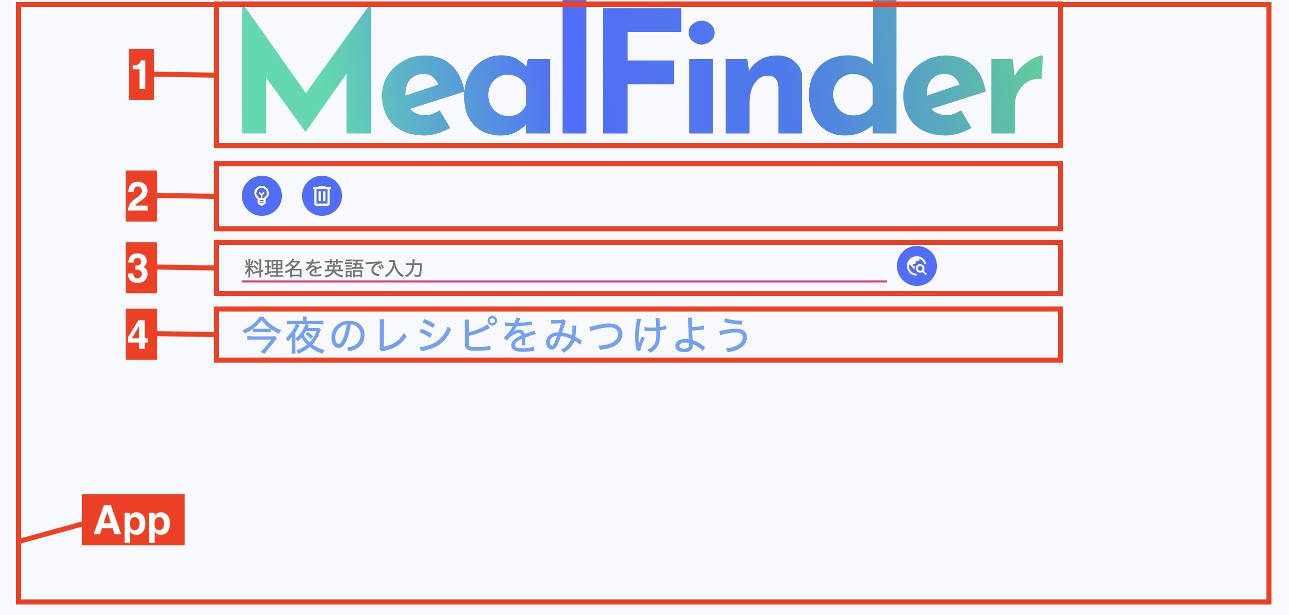 もっとよく見ると、最初の3つのかたまり(Header/Buttons/FormAndButton)が「App」の中に入っているのもわかります。実はこれはそれぞれが「Headerコンポーネント」、「Buttonsコンポーネント」、「FormAndButtonコンポーネント」で、その3つが「Appコンポーネント」によってまとめられているのです。さらにこれは、先ほど見たレシピアプリの画面のコンポーネントと構成が同じで、ブラウザではわかりませんが、コードの上では「Appコンポーネント」によって全体がまとめられています。