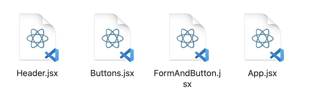 // App.jsx import Header from "./Header.jsx" import Buttons from "./Buttons.jsx" import FormAndButton from "./FormAndButton.jsx" const App = () => { return ( <div> <Header/> <Buttons/> <FormAndButton/> </div> ) }